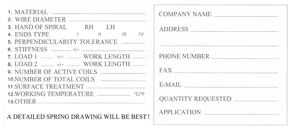 1. provide technical drawings, detailed dimensions or sample quotation. We can also design springs according to your requirements.